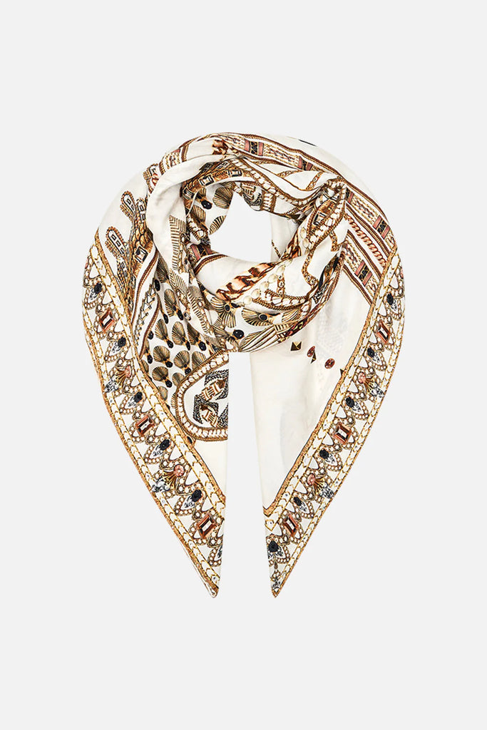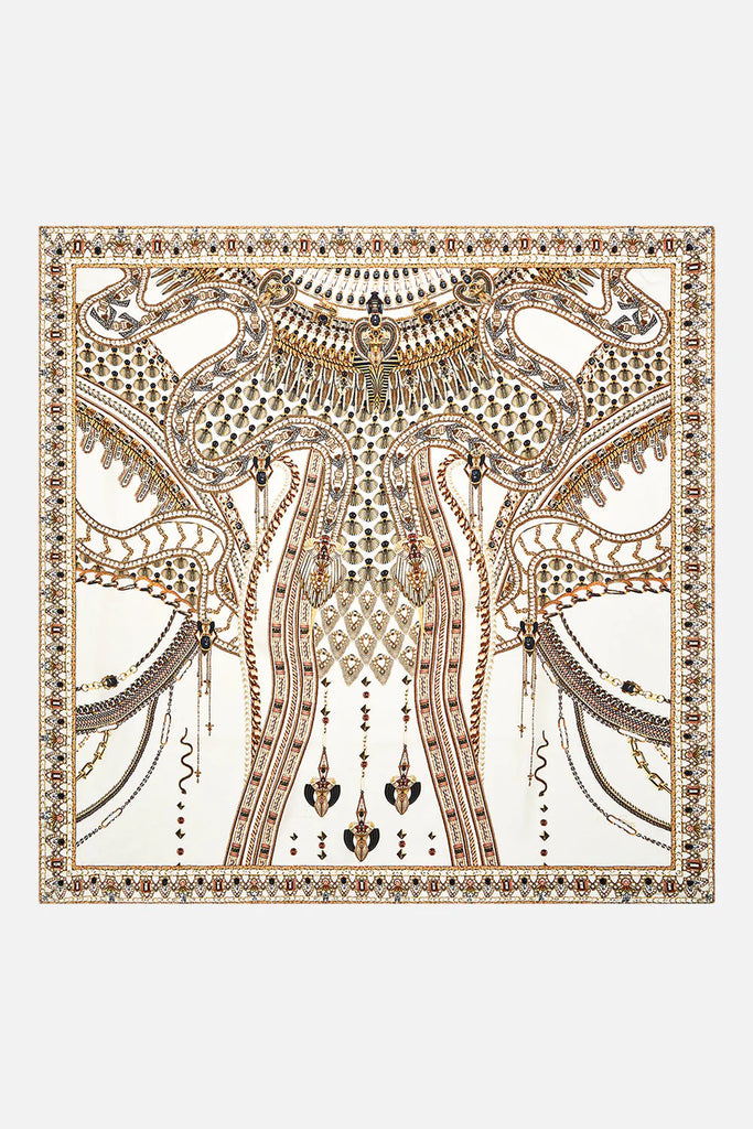 Designed in Australia, The Goddess Energy Large Square Scarf exudes enchantress vivacity with opulent tonal gold and metallic detailing and lotus and snake motifs, imbued on a white canvas. Lovingly handcrafted, this luxury silk scarf features a large expanse adorned with a bespoke print and crystal embellishments. Wear tied as a fitted summer strapless or halter top, drape around the neck or shoulders as lavish layering, or wear over swim as a resort wear shrug or sarong. This luxury silk scarf is the ultimate statement style piece.