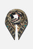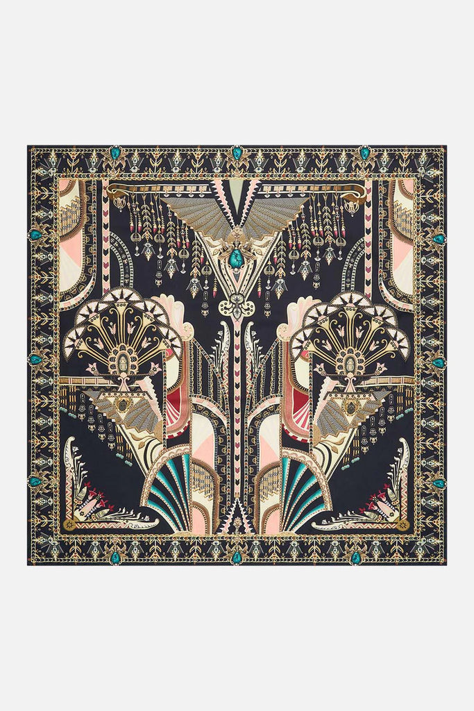The They Call Her Nefertari Large Square Scarf depicts an ancient world of ankhs, scarabs, Egyptian phoenixes, and majestic gods. This luxury silk scarf features a large expanse adorned with a bespoke print and crystal embellishments. Wear tied as a fitted summer strapless or halter top, drape around the neck or shoulders as lavish layering, or wear over swim as a resort wear shrug or sarong. This luxury silk scarf is the ultimate statement style piece. Explore more from the House Of The Sun collection.