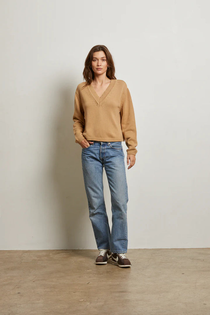 the addie sweater is that just-right layer you’ll reach for every time. made from 100% cotton with a flattering v-neck, slightly boxy fit, and a soft dropped shoulder. it’s not cropped, not tight, not trying too hard, just perfectly slouchy in all the right places.