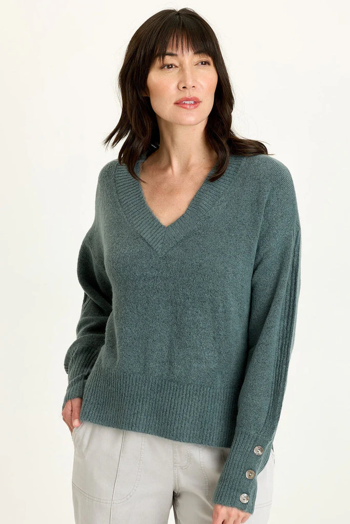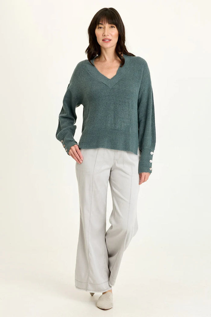 Voluminous sleeves, a relaxed fit, and v-neck collar bring out the ultra-cozy feel of this sweater in our soft Mirelli Knit.