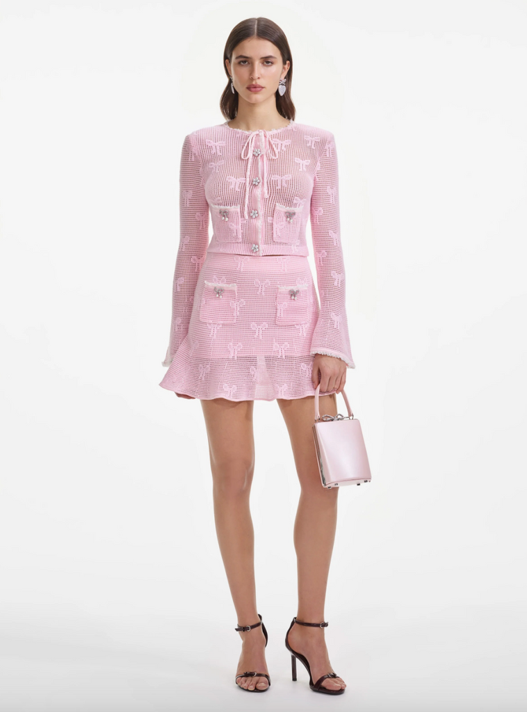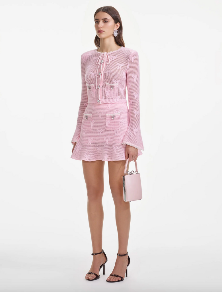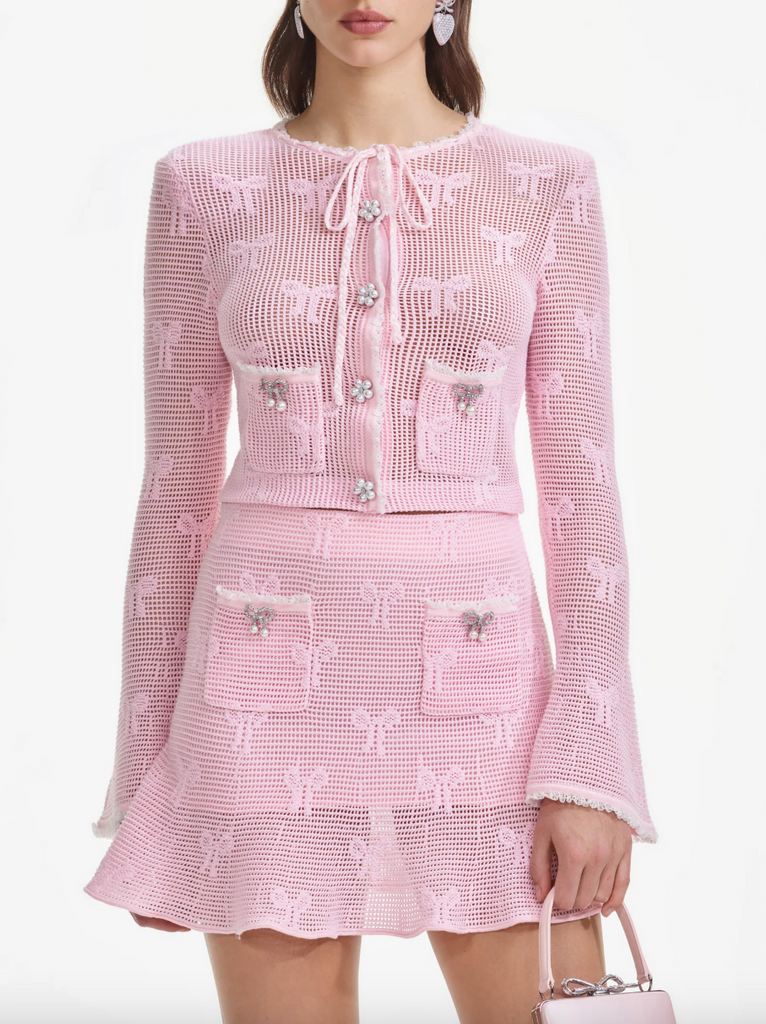 Channel boho chic in this pink crochet mini, which boasts diamanté accents and a flirty, flared hem. Style with a t-shirt for date night or pair with the matching top for a ritzy afternoon tea.