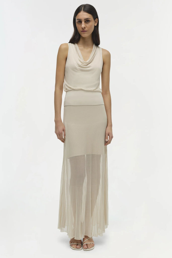 The Gennie Knit Midi Skirt in Sand. Crafted from sheer combo knitwear, this maxi features layered textures and a flowing silhouette.