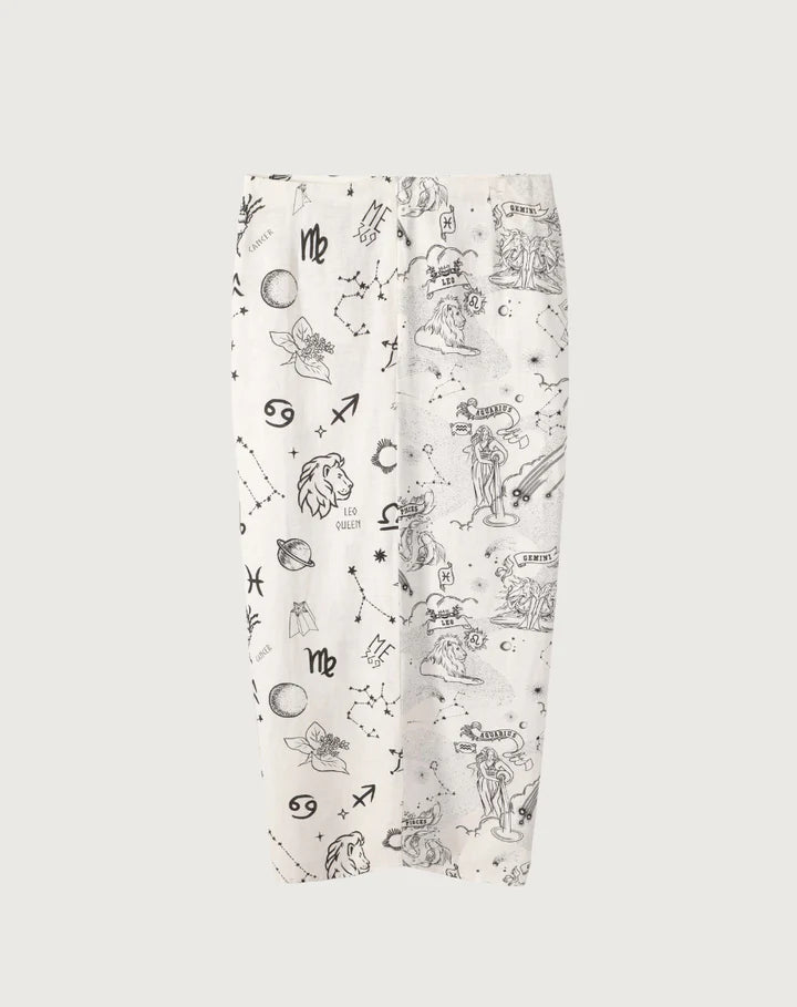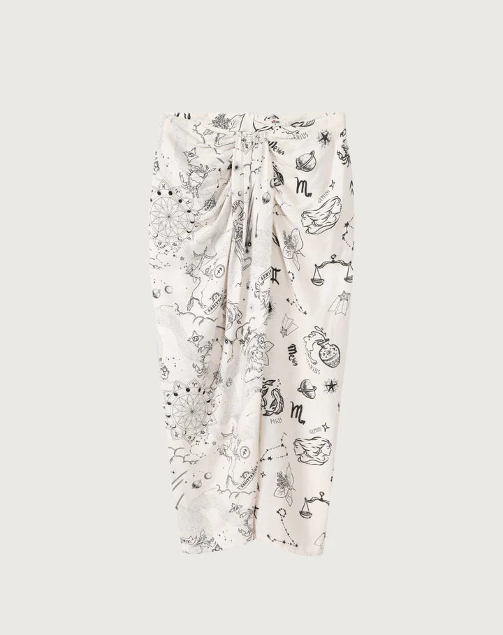 Blend tie front skirt in our Zodiak print. Skirt is maxi length with a slit to the thigh in front.