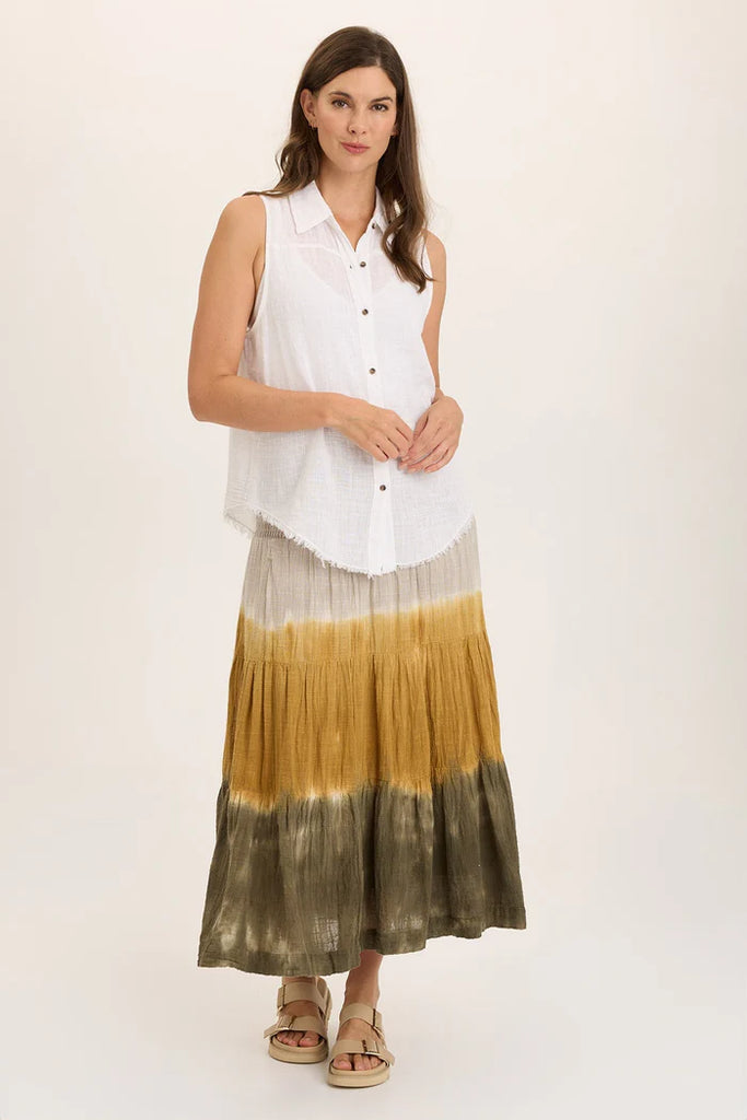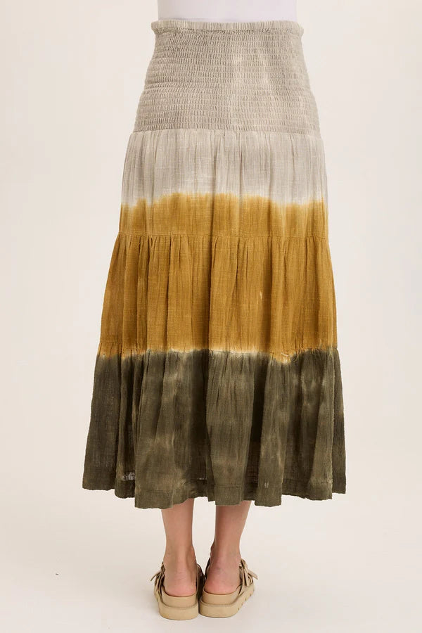 A shirred high waist and tiered, flowing silhouette make this Cocoon Gauze midi skirt as comfy as she is twirl-worthy.