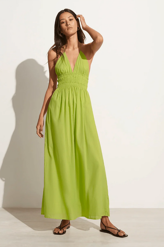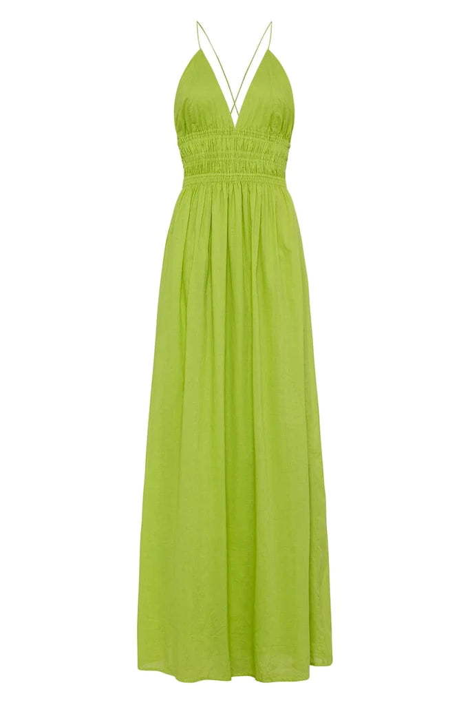 An occasion-ready silhouette lies in the Bisetta Maxi Dress. Cut from certified organic cotton voile hand-dyed in a statement Kiwifuit green hue, this maxi dress features a flattering triangular bust, thin cross back straps and a fitted waistband cascading down into a floating full length skirt. From relaxed long lunches to sundown soirees, arrive in style to all your occasions in the Bisetta.