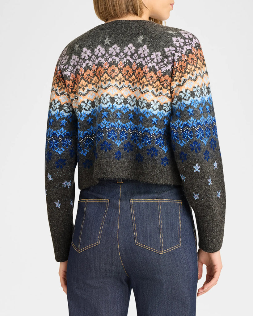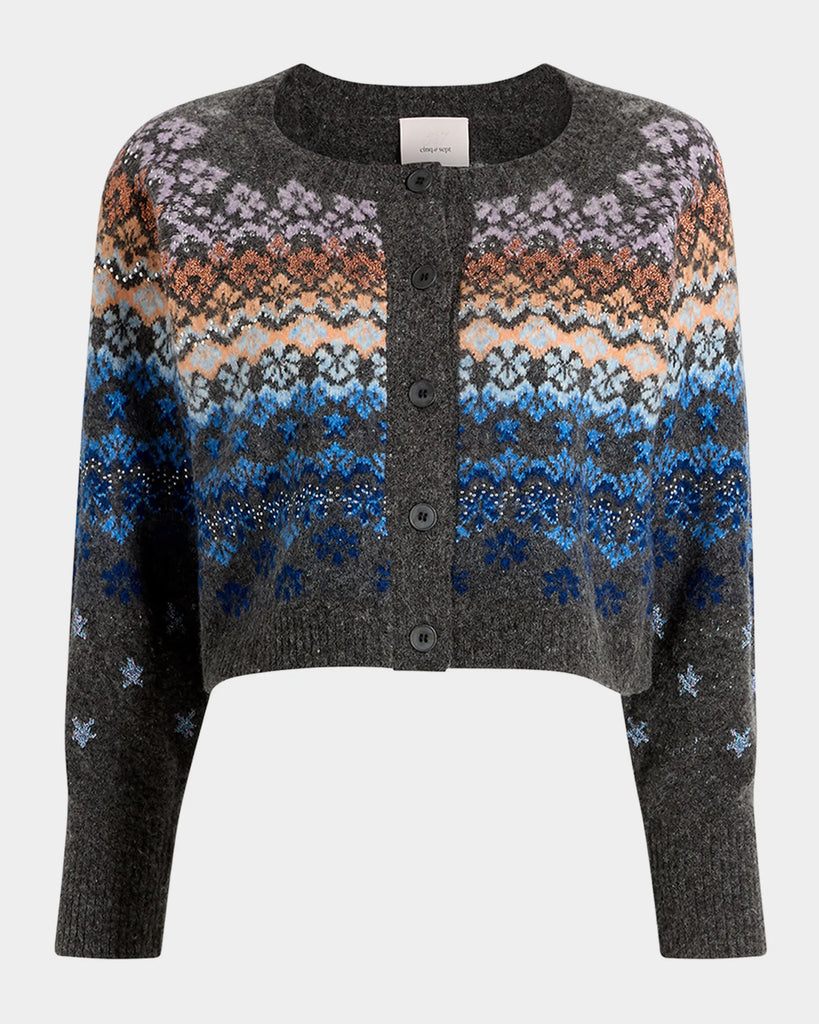 • Crafted in soft cotton, the "Millie" cardigan by Cinq á Sept features a multi-color fairisle motif with shimmering embellishment.