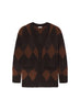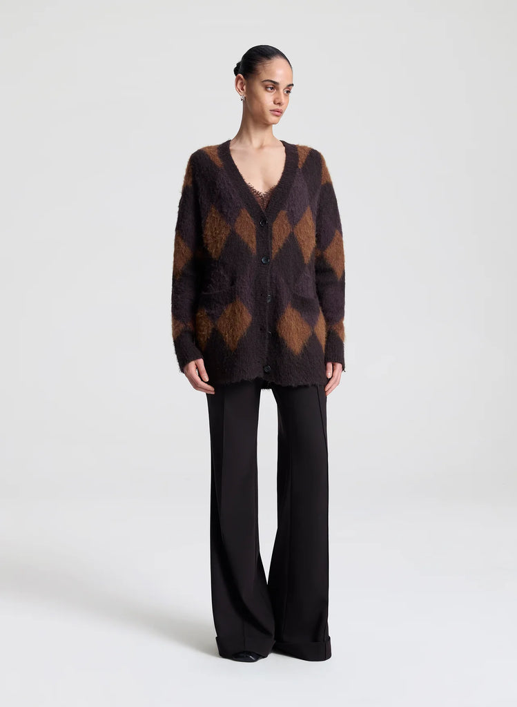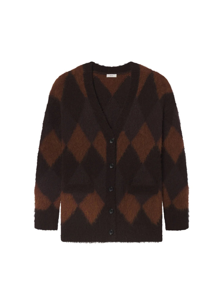 A classic argyle in deep plum, tan, and umber defines this brushed Italian alpaca cardigan, designed with a lightweight feel and oversized fit.