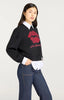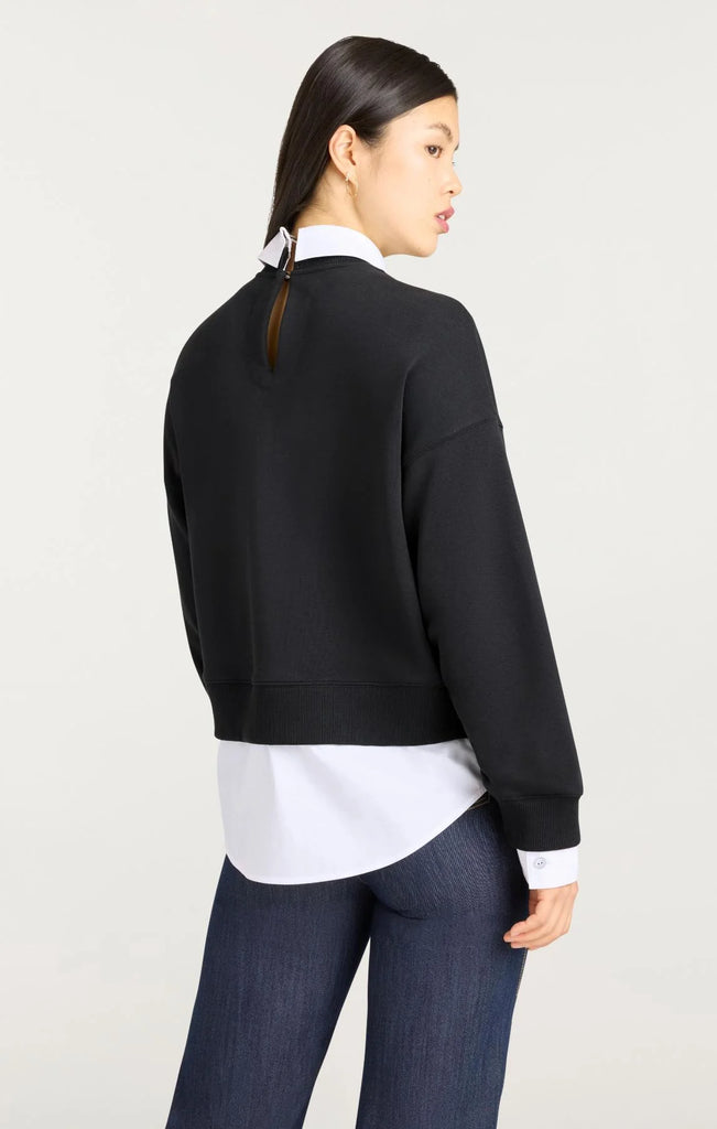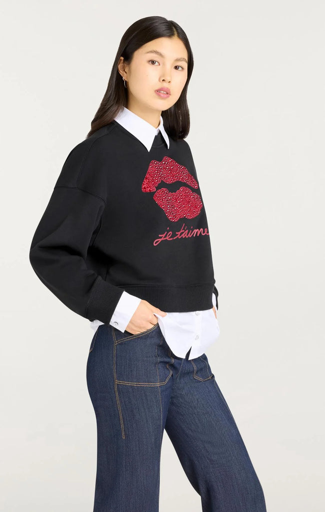 The Je Taime Justina Pullover boasts a two-layer design that combines a crisp collared shirt with a sleek black cropped sweater. The bold red embellishments and the classic French words "je t'aime" at the center adds that chic finishing touch. Perfect for a polished yet relaxed look, this pullover offers both comfort and fashion in just one piece.