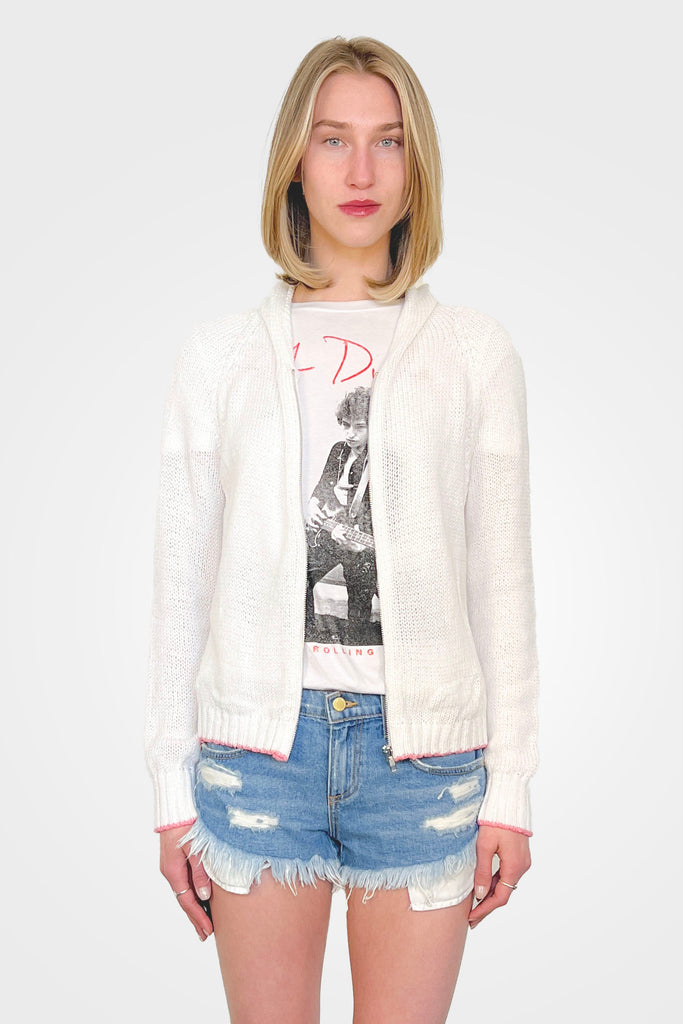 Stay cozy and stylish with this lightweight hooded sweater, crafted from a soft cotton blend for exceptional comfort. Featuring a zip-up front and subtle trim accents on the cuffs and hem, it’s perfect for layering on casual days. Designed with a relaxed fit, ribbed cuffs and hem, and mini side slits, this sweater blends versatility and charm, making it a go-to piece for any wardrobe.