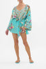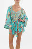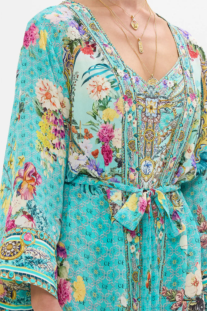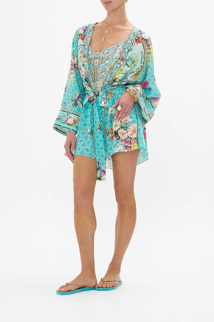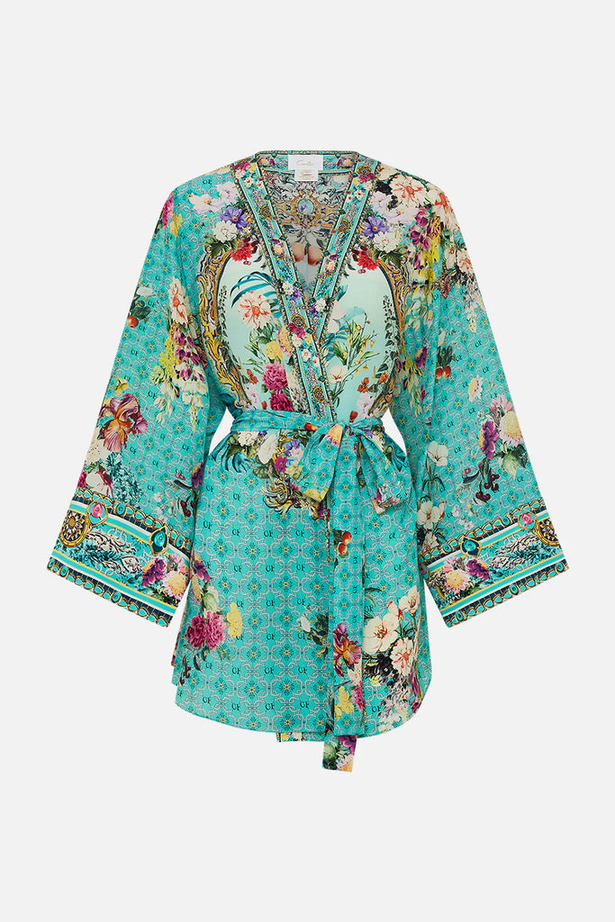 Designed in Australia, The Gardens Of Queluz Short Kimono Wrap invites you into Queluz Palace, where vivid greens and lush florals blend with the elegance of Azulejo tiles, celebrating nature and artful design. Lovingly handcrafted, this stunning luxury outer wear layer is home to a relaxed fit body with and open neckline designed to be worn open or wrapped and cinched in with the contrast waist tie. The slight drop shoulder leads into wide statement kimono sleeves that dance at the wrists with wide contrast cuffs.