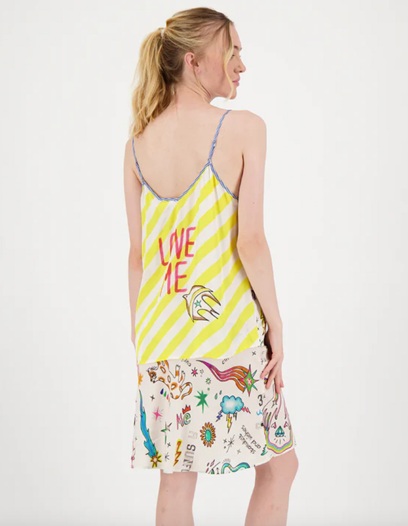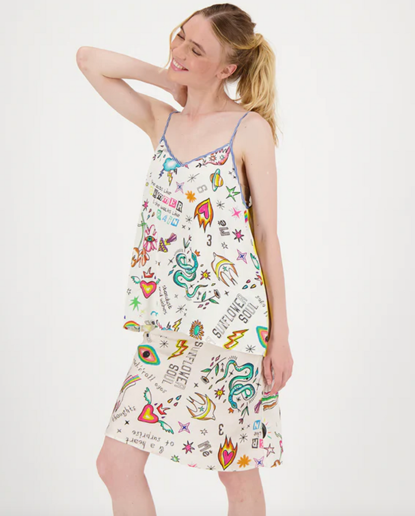 100% Viscose Enlightenment cami. V-neck, spaghetti straps. Back reads “LOVE ME”. Pair with our Grace mini t skirt for a vibrant, fun look.