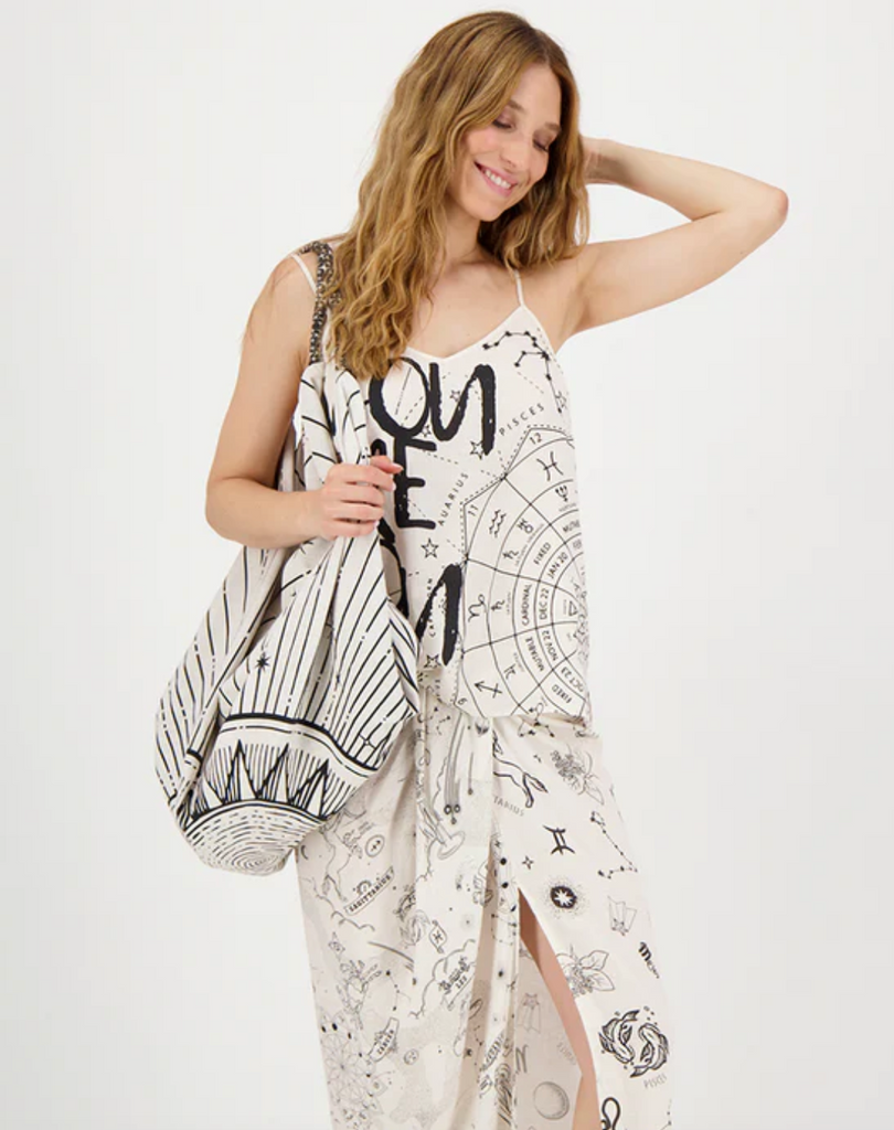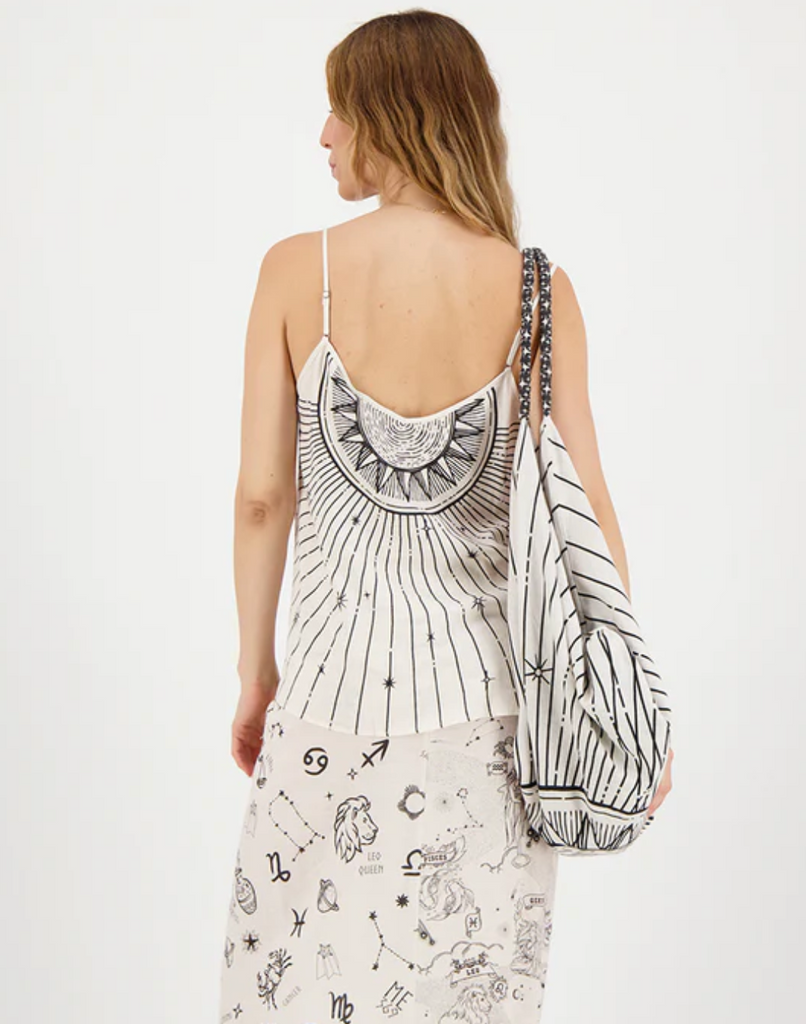 100% Viscose cami. V-neck, spaghetti straps. Back reads “LOVE ME”.