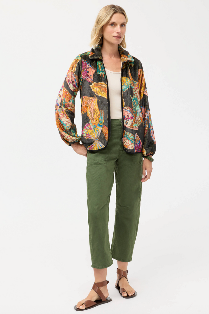 Adorned with a mesmerizing pattern of vibrant butterflies in flight, the Esther Sherpa Jacket adds a splash of color to any look. Featuring a zip-front closure and elastic sleeves, this unique jacket is finished with zippered pockets and a unique curved hemline. Layer over a casual black dress and pair with knee-high boots for a fun girls' night out.