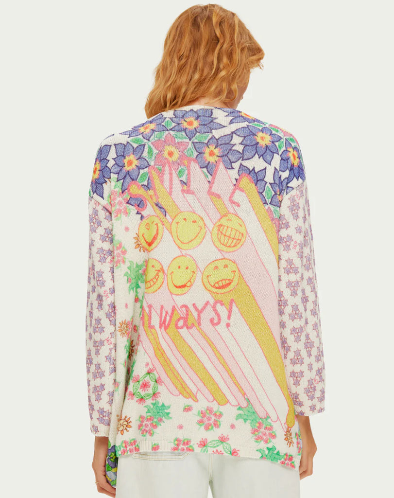 Mykonos cardigan from our Markers collection, featuring hand-painted flowers in pink, purple, and orange across cream. Purple floral clusters scatter down the sleeves, while geometric cube patterns in lime, yellow, and pink add sharp contrast. "I DESERVE EVERYTHING WITH" text appears in turquoise alongside yellow smiley faces.