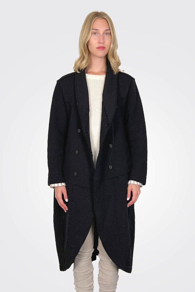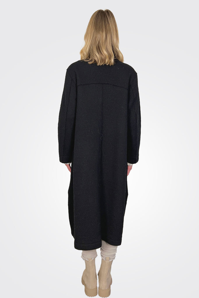 Oversized coat with button enclosure. Makeshift lapel with rounded hem
