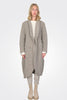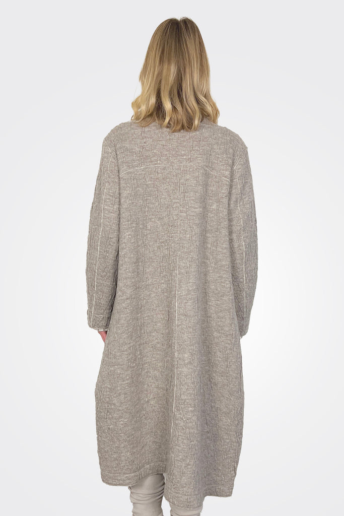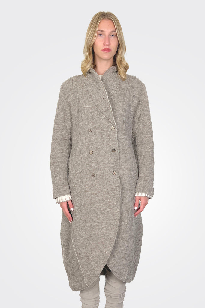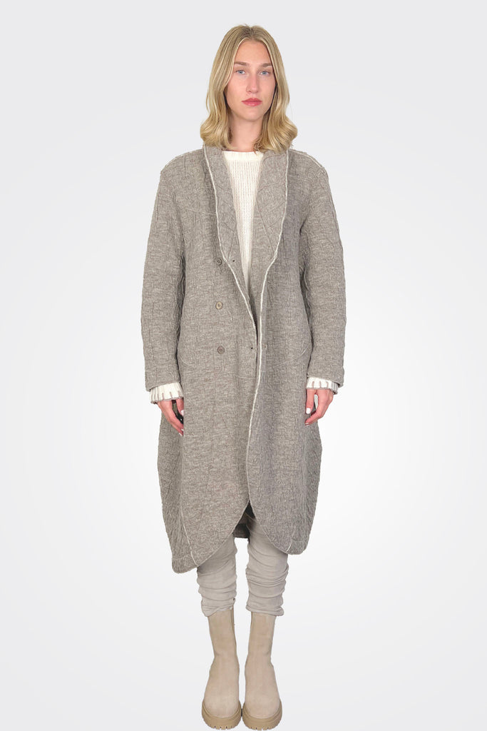 Oversized coat with button enclosure. Makeshift lapel with rounded hem