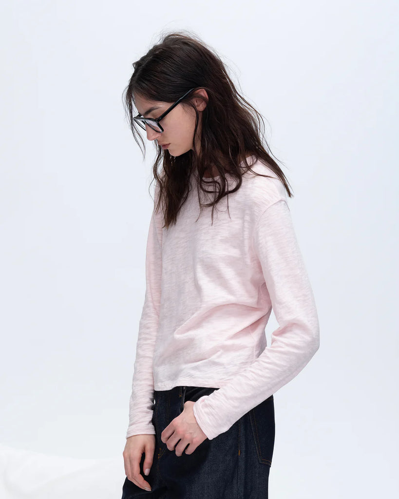 The Slub Jersey Long Sleeve Crop Tee is lightweight and breathable, delivering a soft, airy feel. Made in Peru from 100% Cotton, it features long sleeves with sleeve cuffs, a relaxed crew neck silhouette, and a subtle sheer finish for a modern, effortless look. The loose weave of this heavier cotton gently conforms to the body, creating a naturally flattering drape.