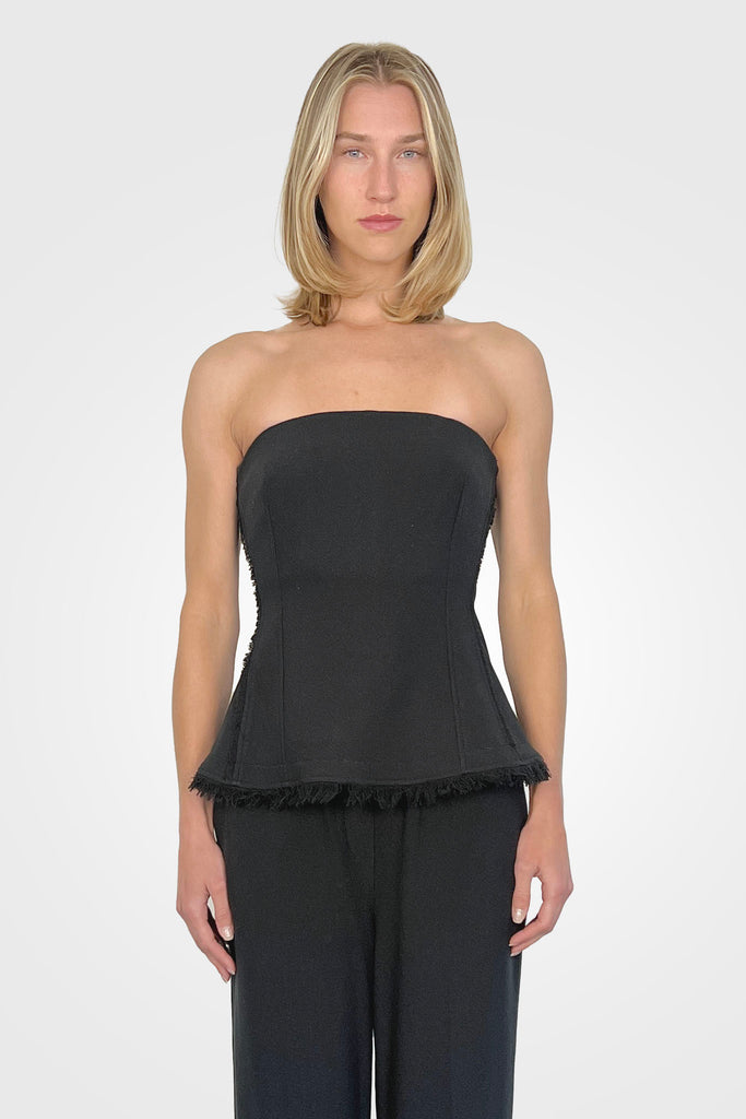 Featuring frayed crossweave draping, this strapless bustier offers a textured, structured silhouette with refined detailing.