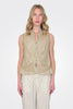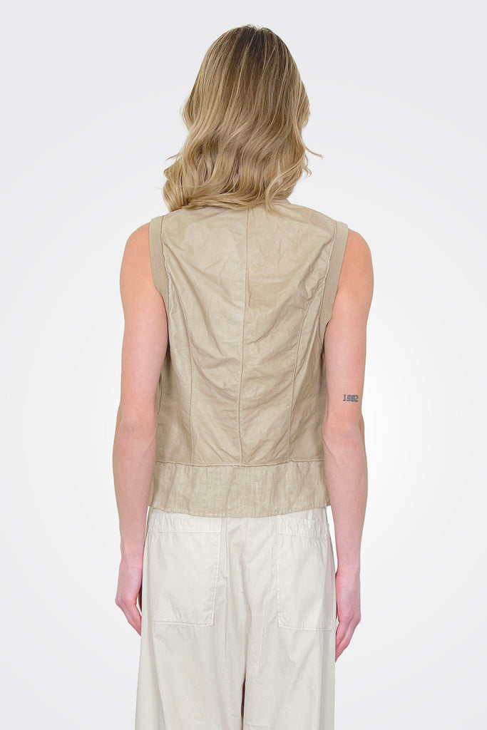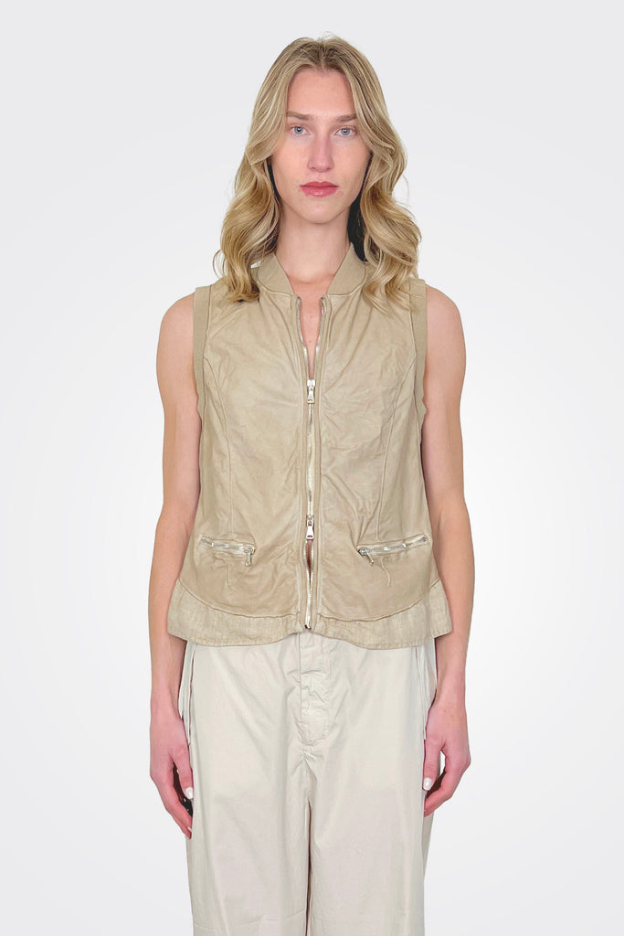 Slim fit leather vest with linen insert at the bottom and knitted inserts on the neck and armholes. Fastened with a zip. Garment dyed.