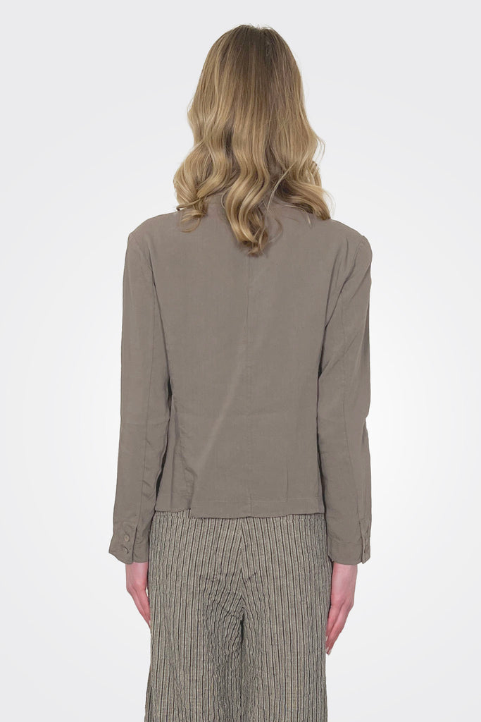Short, unlined, and slightly tailored jacket made of a linen-viscose blend. The piece features front and back vents, a band collar with shaped buttons, and front patch pockets with flaps. Dyed.