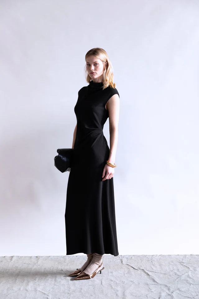 This sleeveless dress features a soft draped neckline that adds subtle movement, complemented by a delicate side gathering at the waist, which adds shape and a touch of texture without breaking the harmony of the cut.