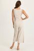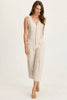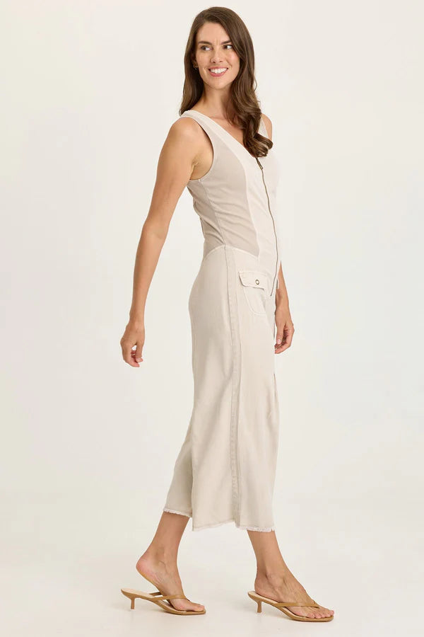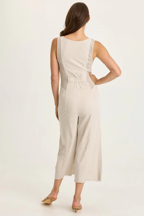 Bra-friendly tank top straps melt into a v-neckline with a brass zipper closure. Rib inserts keep the silhouette contoured and flexilble, while flap pockets lead into a pleated cropped wide-leg. In soft Taissa Twill, this is a jumpsuit you won't want to miss!
