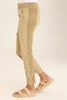 This stretch poplin pant features jersey side inserts for an impeccable fit, a jersey elastic pull-on waistband, two front pocket, one side zip pocket, and ruching on leg front.