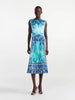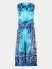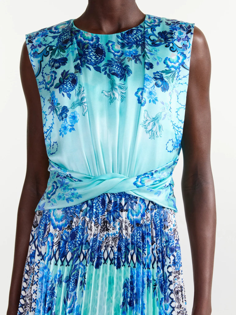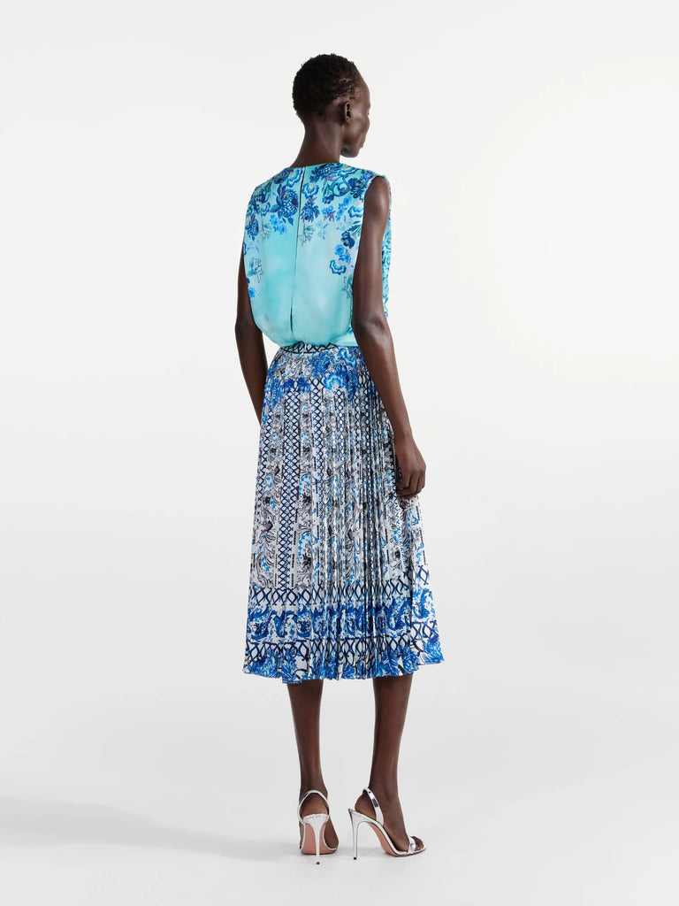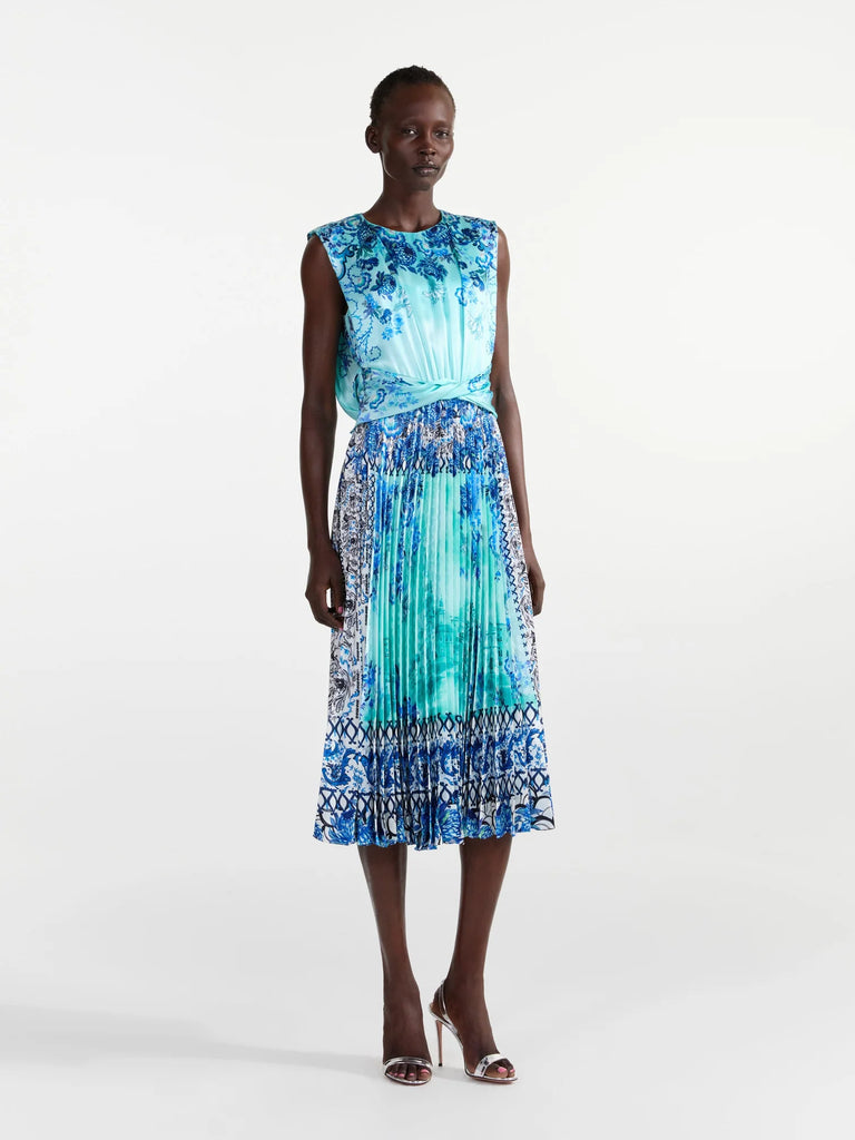 The Gwen-B Dress in Paeonia Ceramic features a sleeveless design with a stunning twisted and gathered detail at the waist, creating a flattering and feminine shape. The pleated skirt flows gracefully, adding elegance to every step, making it the perfect classic summer dress to wear time and time again. The print features an Italian landscape vignette surrounded by floral clusters and a border inspired by Venetian souvenir scarves, adding unique artistic charm to the piece.