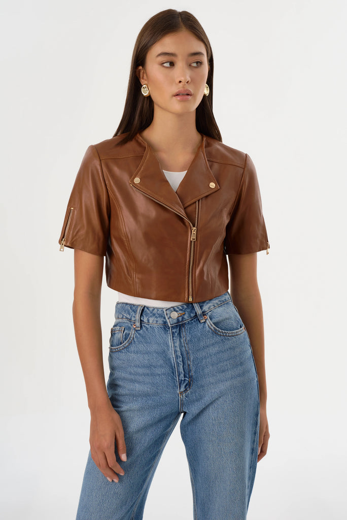 Unexpected in all the right ways, the Kirsi cropped biker jacket is an attractive choice for balmy evenings. Featuring classic biker elements from the asymmetrical closure to the snap lapels & gold branded hardware this beauty hits right at the hips to define your silhouette. You'll fall for its soft-to-the-touch lamb leather body. Lightweight and breathable, this top piece makes a flawless day to night transition.