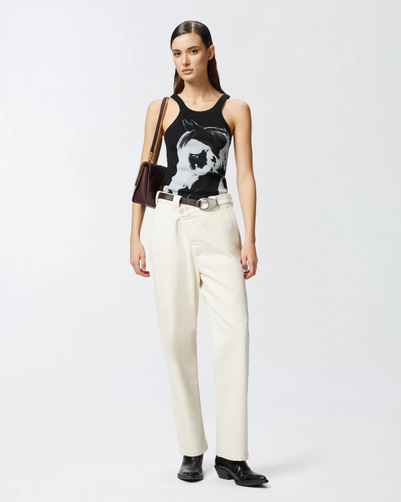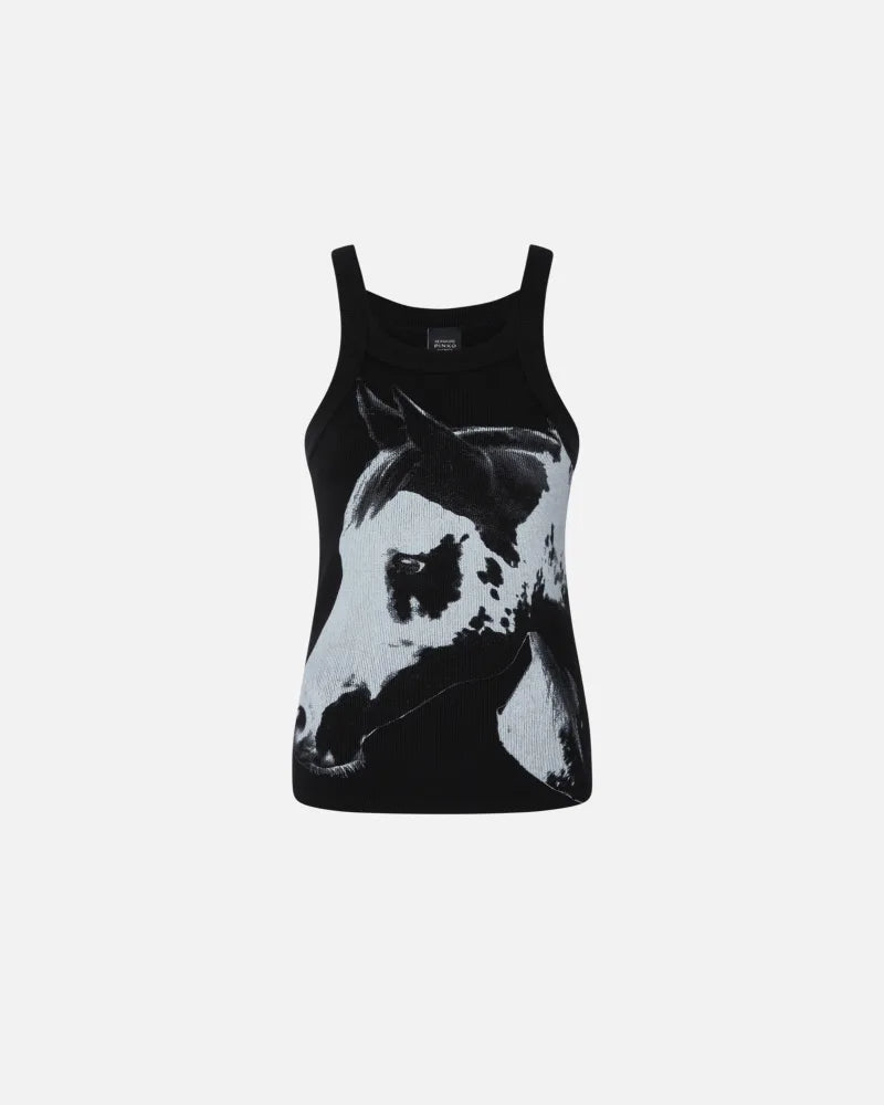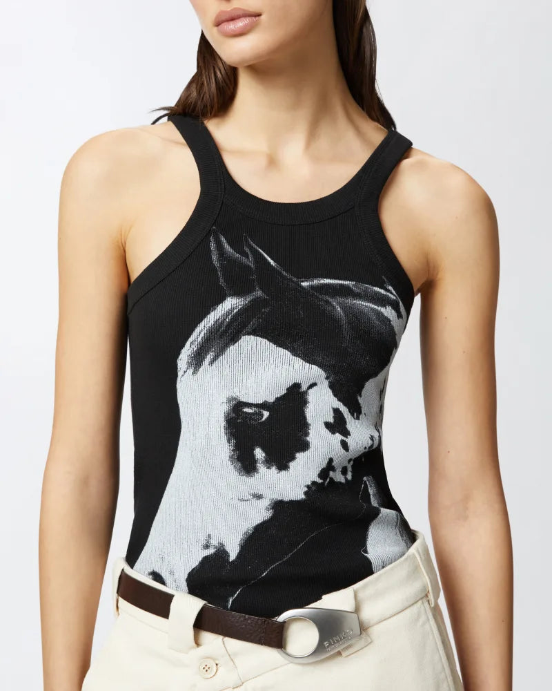 Slim-fitting vest top with spaghetti straps, made from ribbed, organic 100% cotton fabric sourced from a traceable and certified supply chain, and customised with a placed horse-head print on the front. Available in white with a black print or black with a white print, this vest top—wearable whenever and for any occasion—will give your everyday looks a touch of originality. This item is part of the special PINKO Reimagine capsule collection for Spring/Summer 2025, created in collaboration with designer Patrick McDowell, who has always paid close attention to the choice of materials used in his collections to minimise their overall environmental impact.