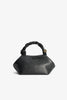 This bag features a tone-on-tone metallic GANNI Butterfly logo, a twisted handle with a braided knot, and a gold-tone metallic dice with a GANNI Butterfly logo engraved. The bag has an internal magnetic closure, a flat card pocket inside, and an adjustable and removable shoulder strap for crossbody wear.