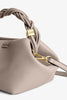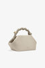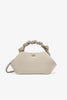 This bag features a tone-on-tone metallic GANNI Butterfly logo, a twisted handle with a braided knot, and a gold-tone metallic dice with a GANNI Butterfly logo engraved. The bag has an internal magnetic closure, a flat card pocket inside, and an adjustable and removable shoulder strap for crossbody wear.